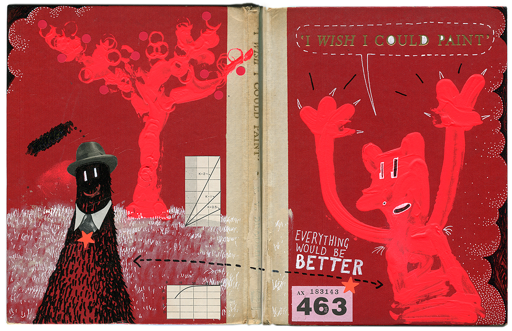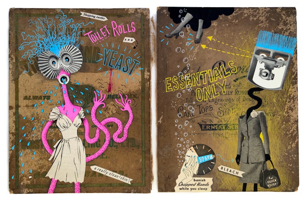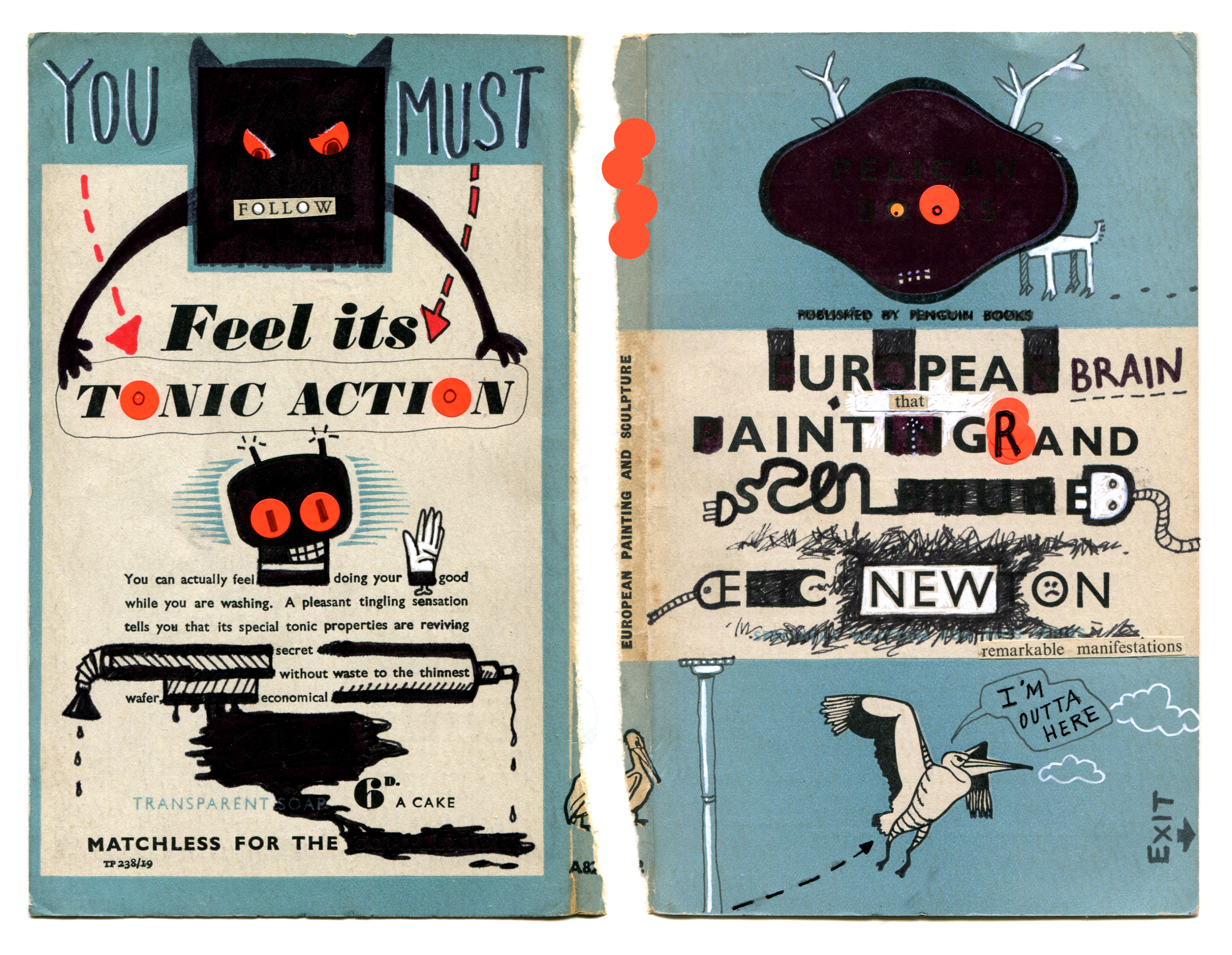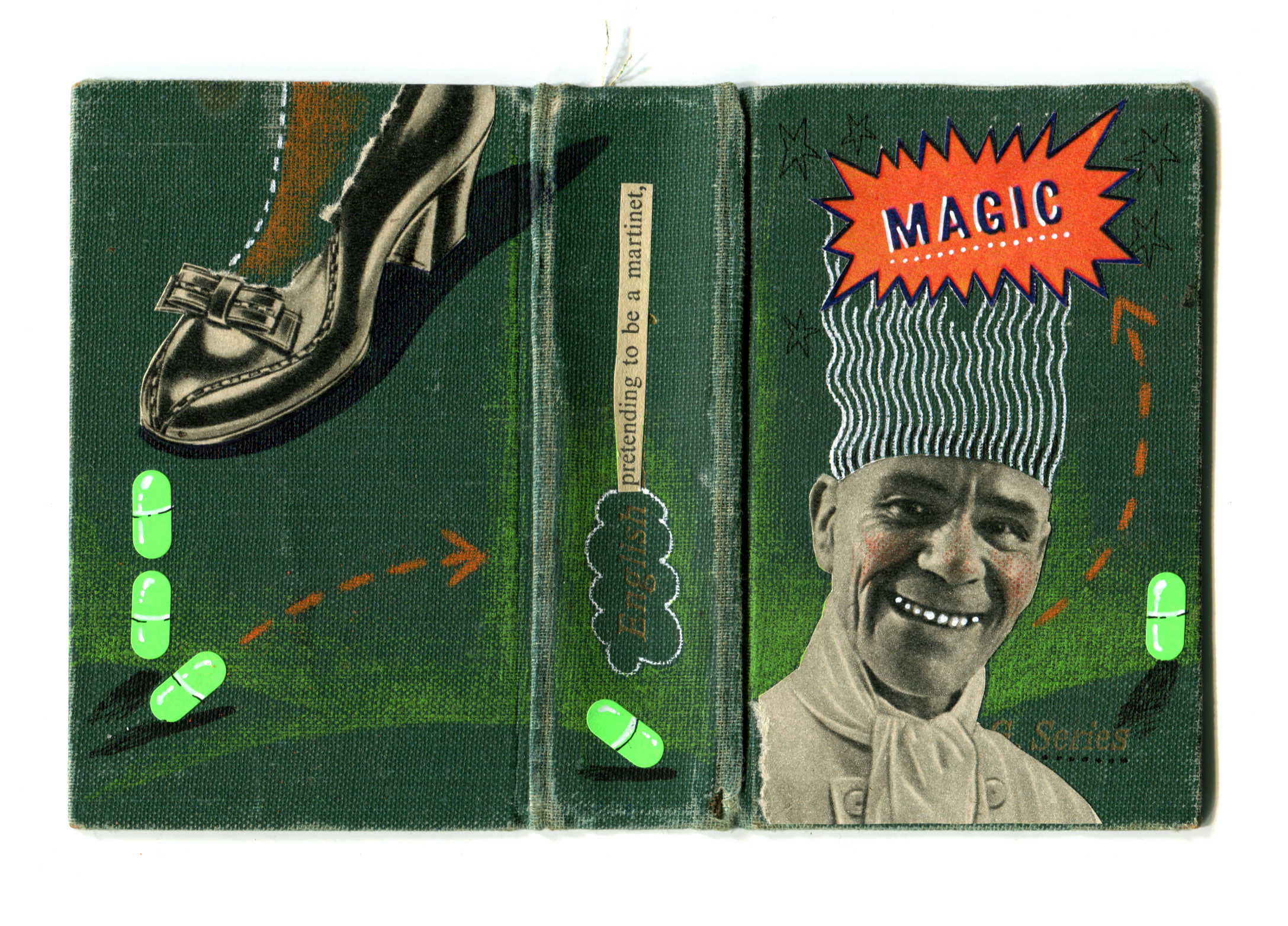 Collage and drawing on withdrawn library book cloth covers. Various sizes and mixed media.