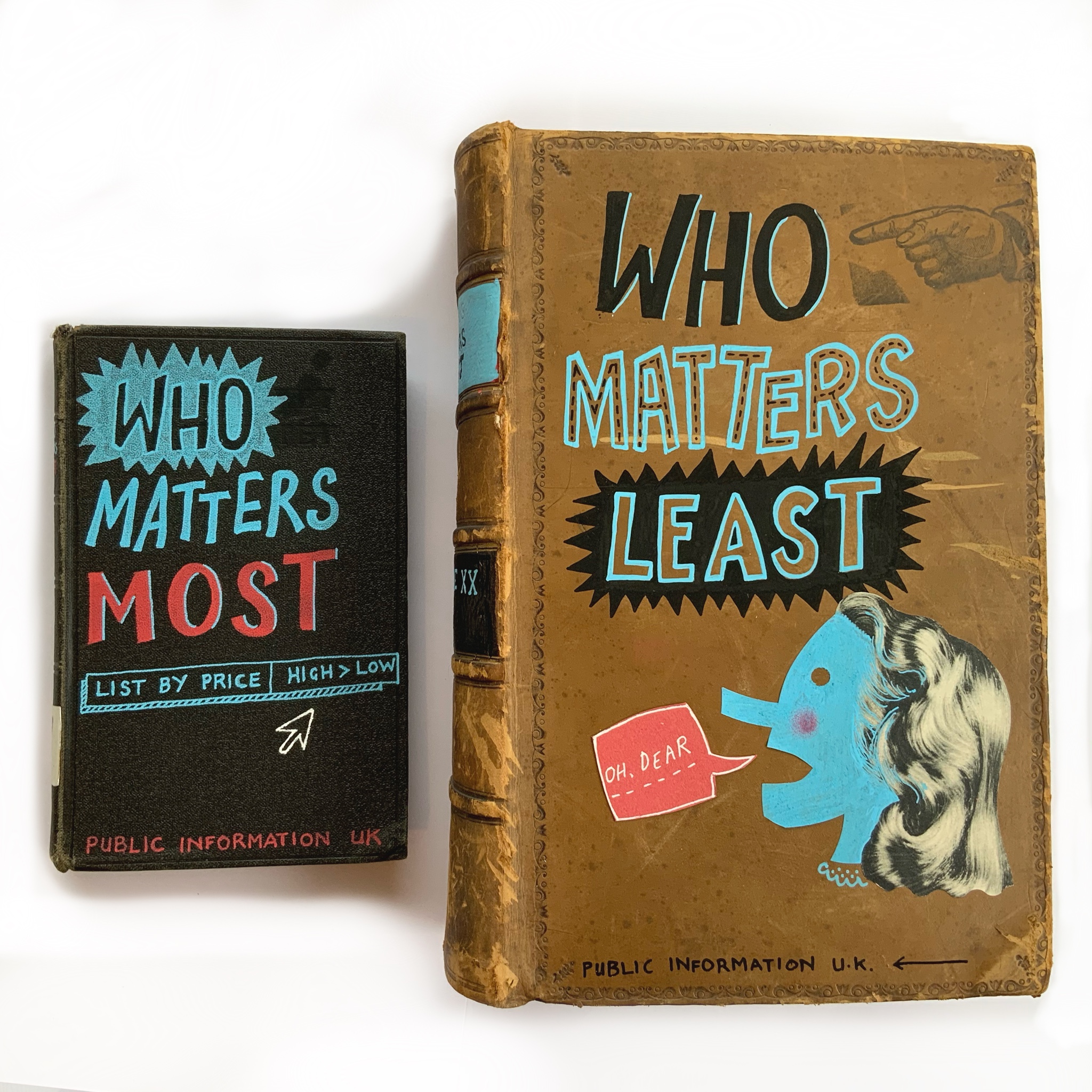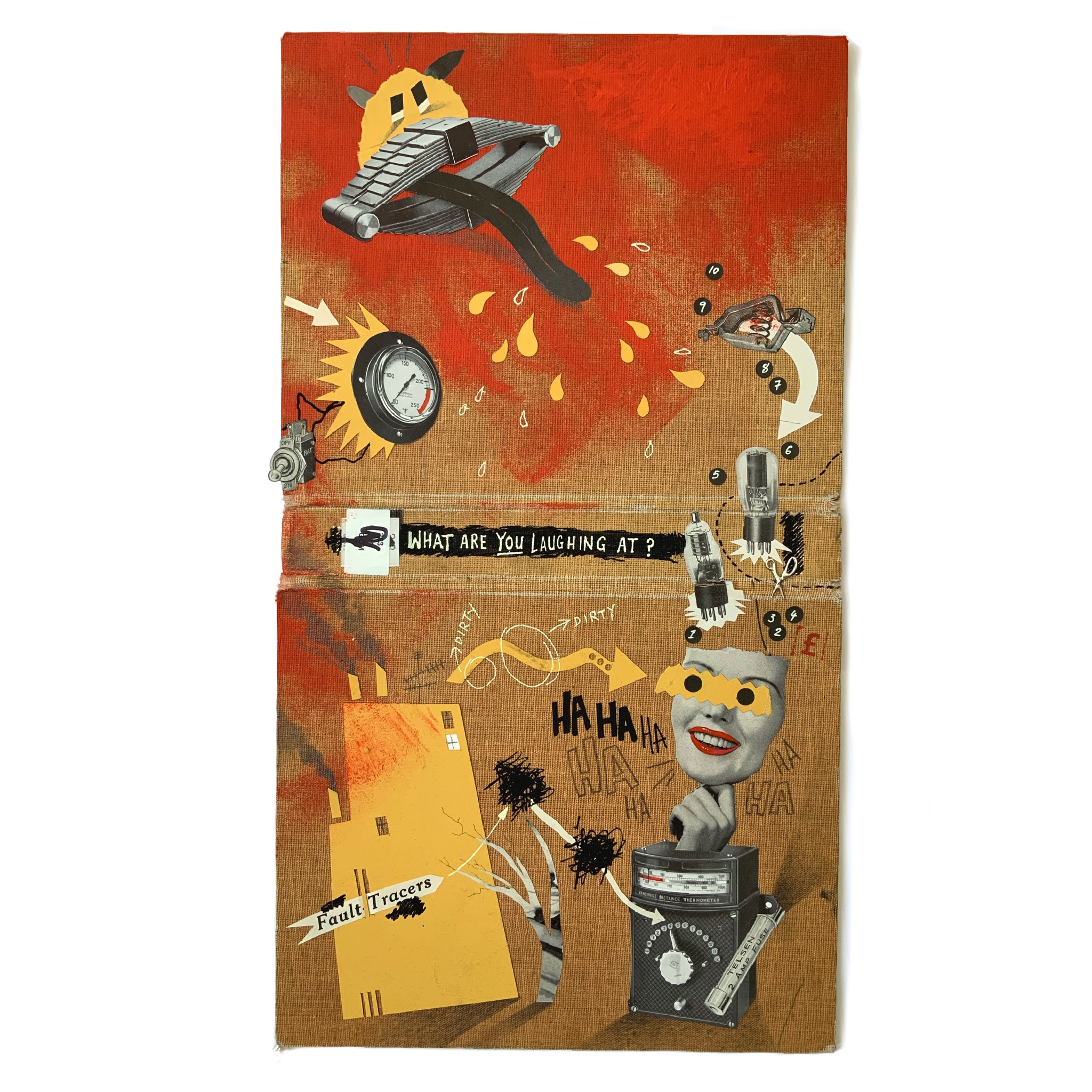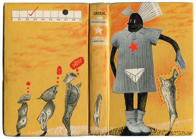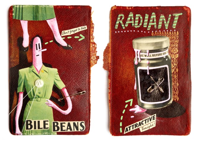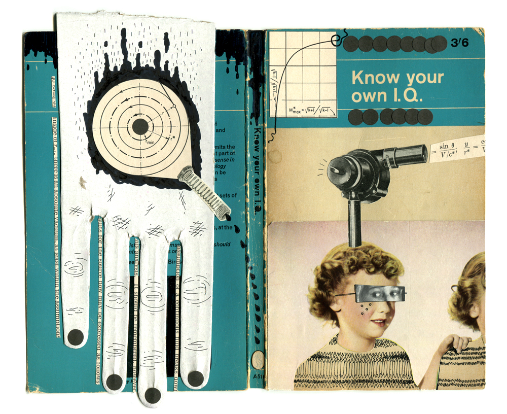 Collage and drawing on withdrawn library book cloth covers. Various sizes and mixed media.