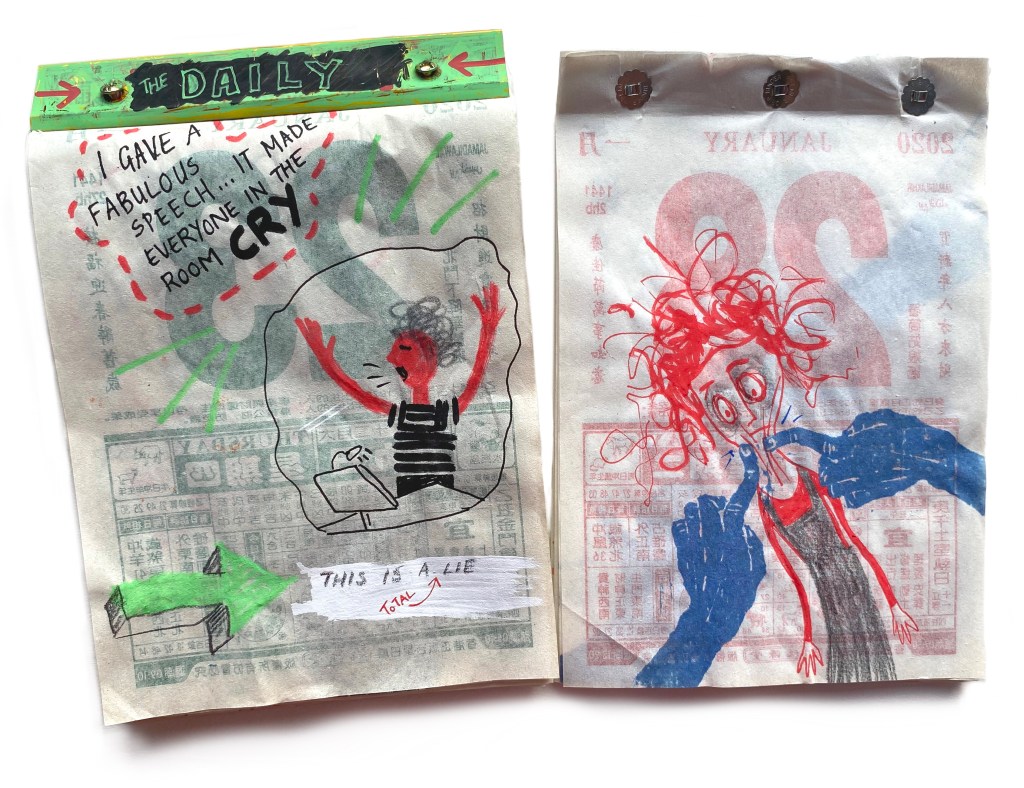 These are daily doodles drawn on the reverse of last year’s calendar. Clipped-together in unsequenced book form, they are drawn using pens, pencils, felt pens and Tippex. They also include rubber stamps that I cut for a different project.