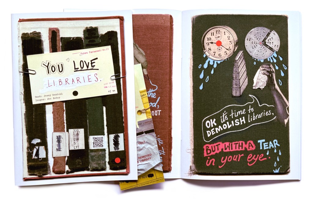 This special library-themed issue of Future Fantasteek! (ISSN 2399-3022) It is a gift in gratitude for all that libraries and library staff do for communities, for literacy, and for intellectual freedom. It contains two 16-line poems about books and libraries by Jessy Randall, illustrated by Jac Batey using withdrawn library books, vintage stationery, tippex, index cards, pens, and collages. The Tête-bêche format means both zines are bound together with one rotated 180 degrees, making two front covers.